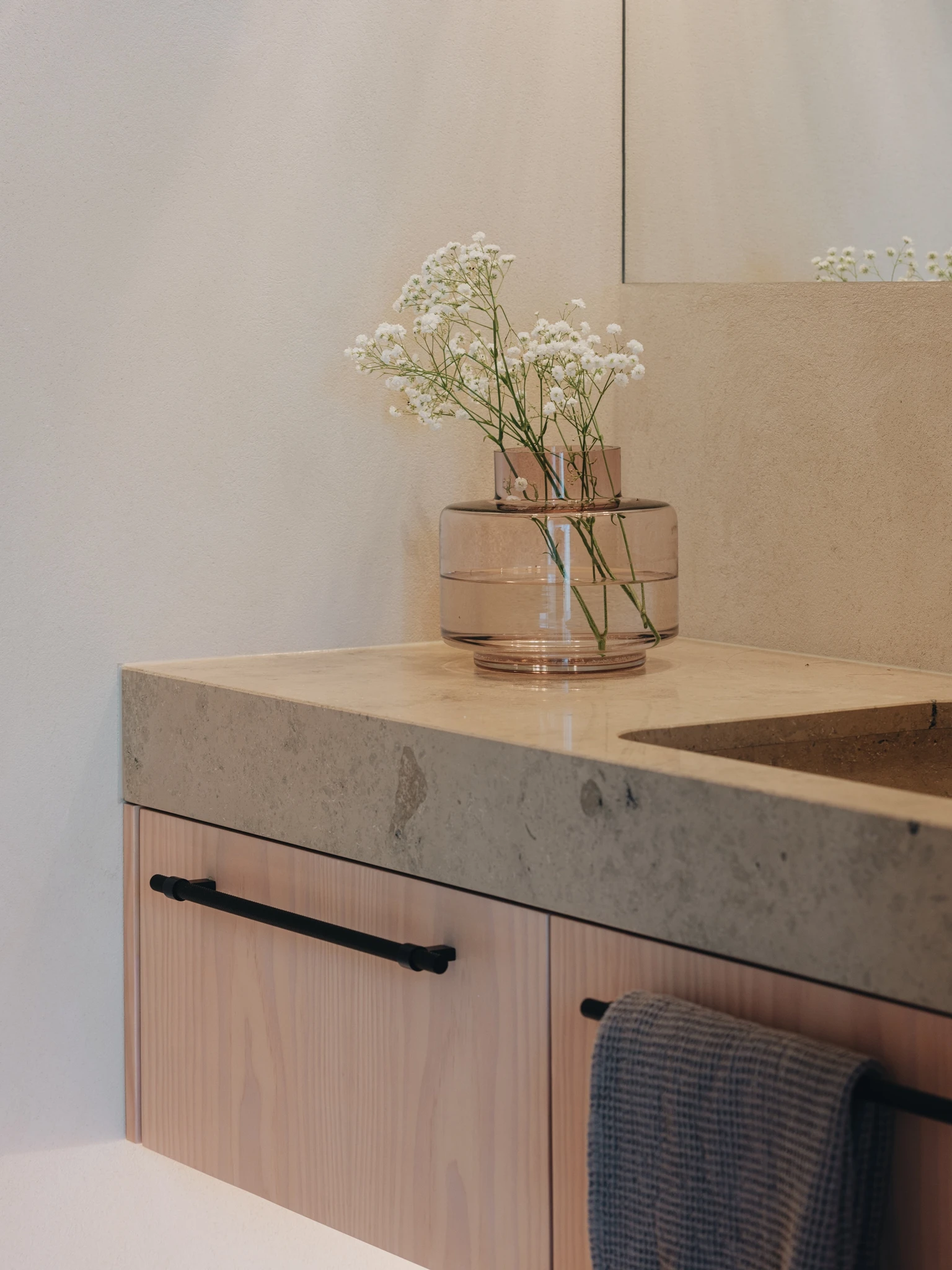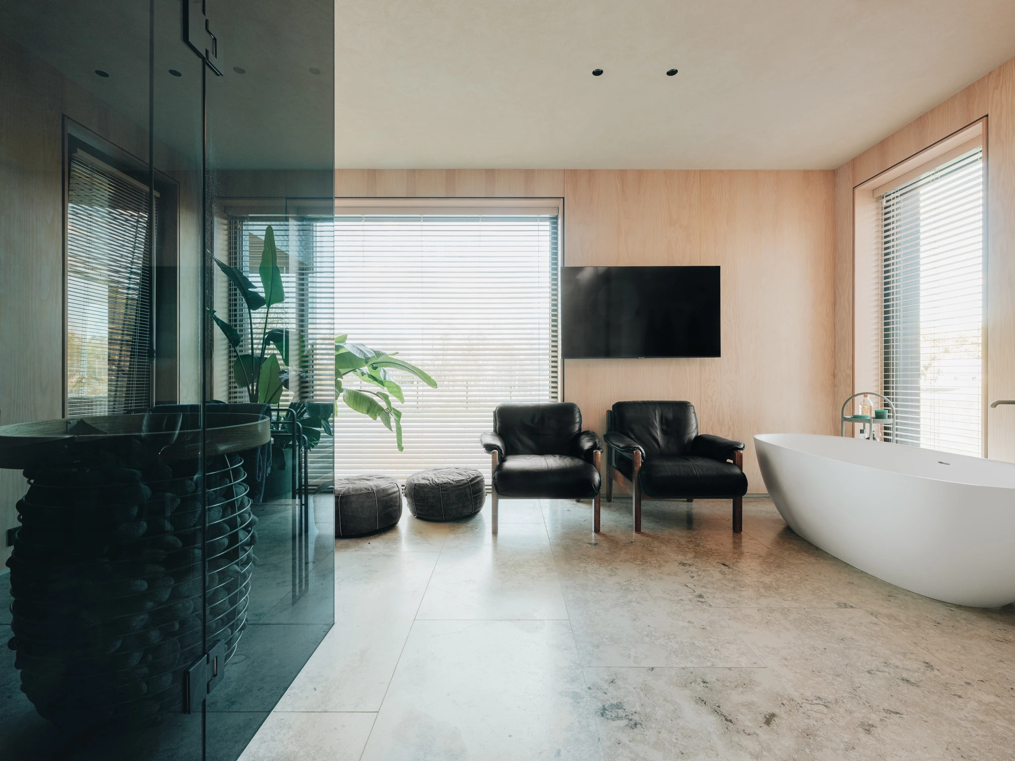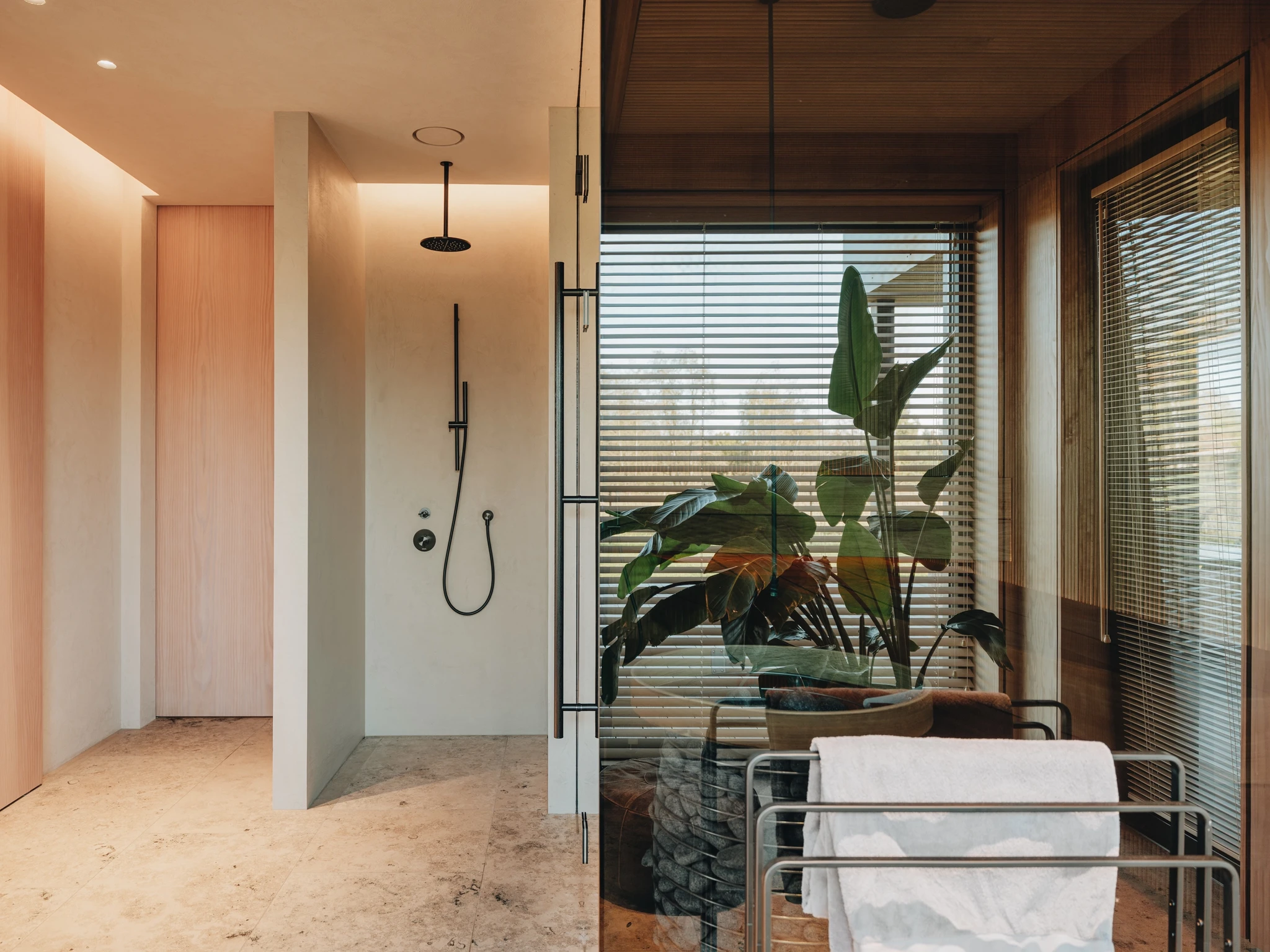 Niiskete ruumide viimistlemisel oli ülesandeks saavutada võimalikult mugav ja kasutajasõbralik ruum. Eelistatud olid vuugivabad ja kergestihooldatavad materjalid. Pinnad jaotati sõltuvalt kasutusintensiivsusest kaheks: pinnad, mis jäävad voolava vee alla (dušinurk, valamutagune seinaosa) ning pinnad, mis voolava vee alla ei jää (niiskete ruumide ülejäänud seinad ja laed). Nii valiti vettpidavatele pindadele materjaliks mikrotsement, ülejäänud pinnad viimistleti lubipahtliga.Sauna eesruumi lagi kaeti lubipahtliga. Tegemist on pinnaga, mis ei pea olema veekindel. Nii on igasuguse loodusliku viimistlusmaterjali kasutus sellistes kohtades õigustatud.